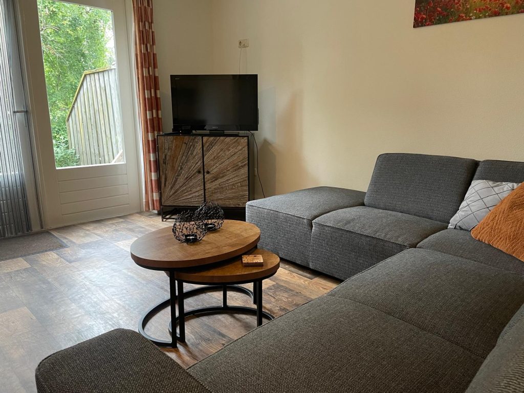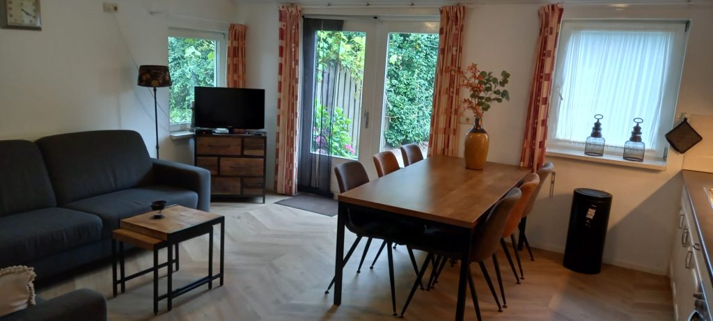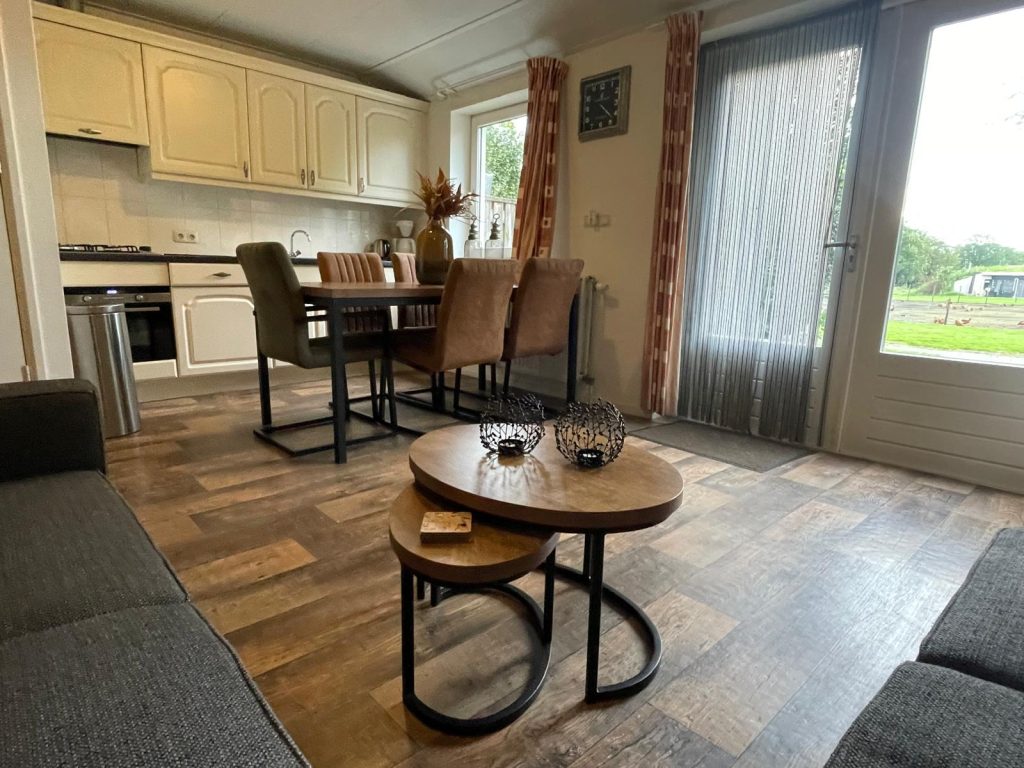 - Sfeervolle woonkamer met comfortabele zithoek, waar je kunt genieten van een goed boek of een kop koffie met uitzicht op de kippen.
